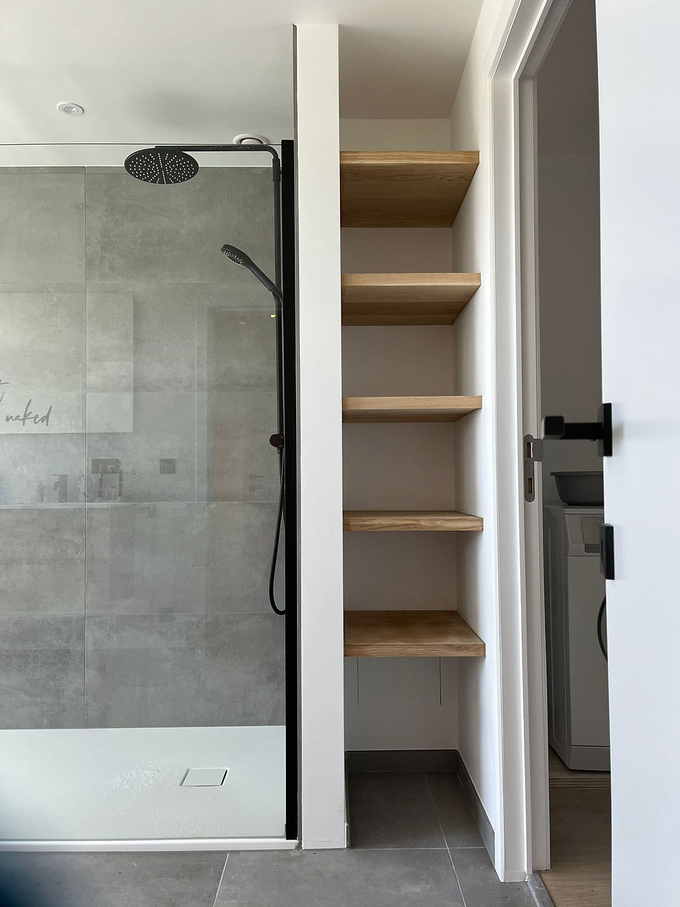 Bij deze renovatie werden deze massieve eiken leggers geplaatst. Deze leggers bieden een estetische en functionele meerwaarde aan de badkamer.