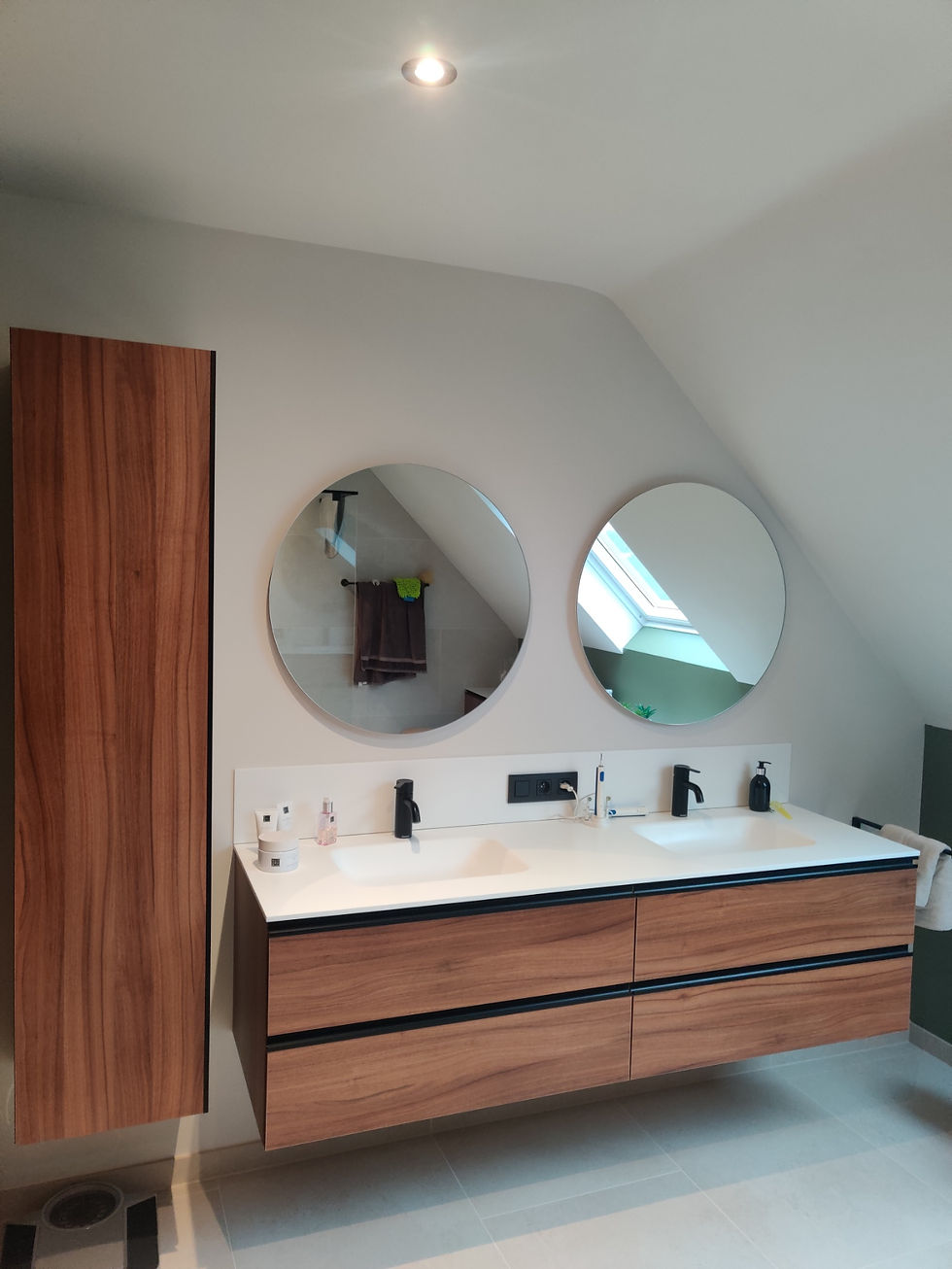 Totaalrenovatie tot een moderne badkamer met kwalitatieve materialen. Na afbraak van de oude badkamer werd deze ruimte voorzien van een nieuwe vloer, Velux, sanitair en het maatmeubilair.